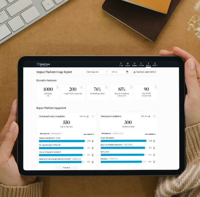 With the FranklinCovey Client Dashboard, you’re not just tracking progress; you’re transforming insights into strategies that drive meaningful organizational change. Empower your learning and development initiatives with the data and tools you need to achieve measurable success.
